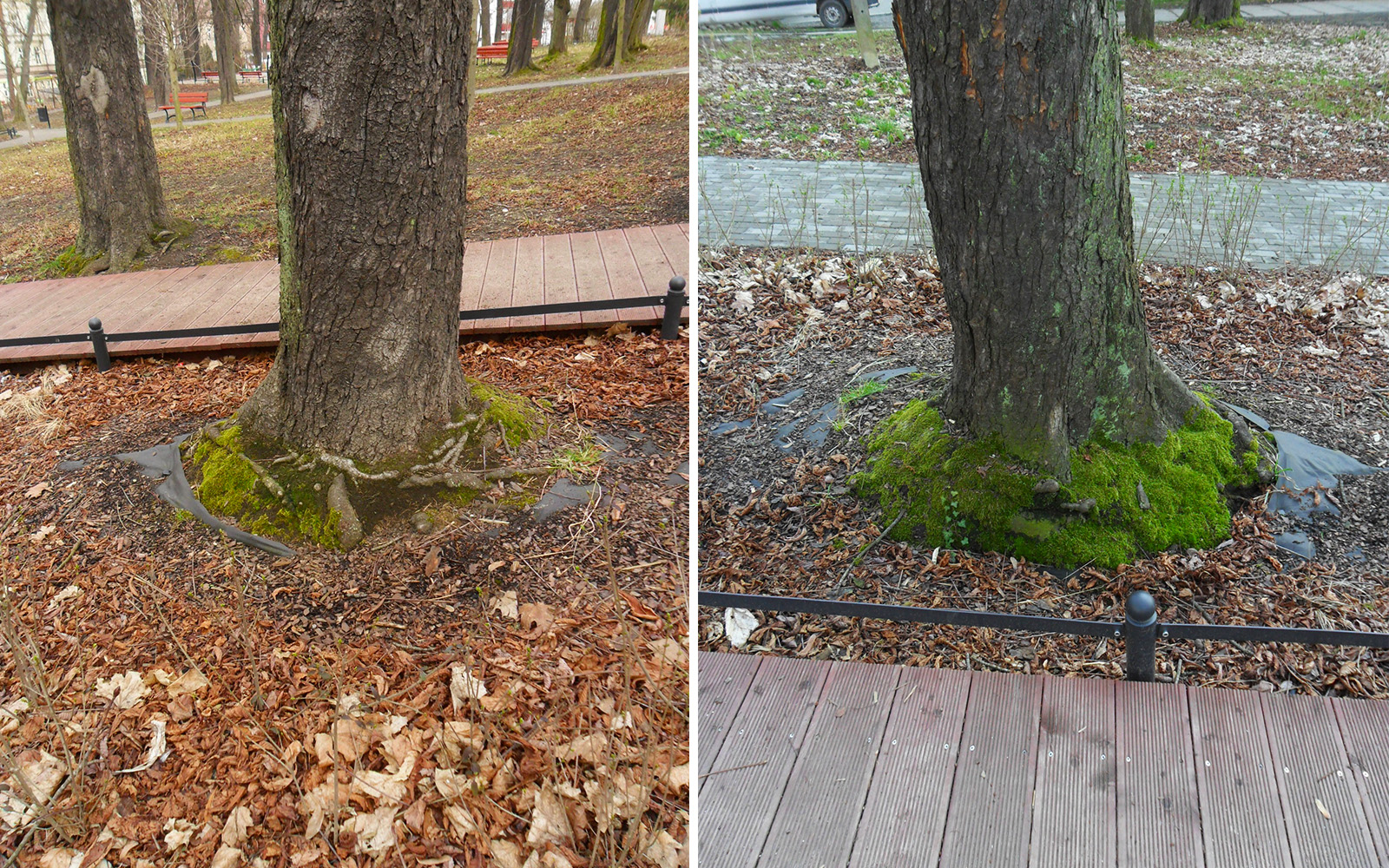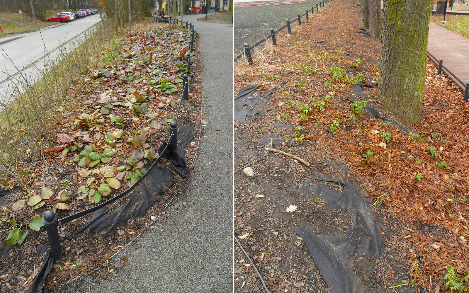 No tak, powiecie, ale co z chwastami i co z estetyką? Ano nic. Tzw. chwasty i tak wyrosną, zwłaszcza gdy dodatkowo pokryje się agrowłókninę warstwą kory czy zrębków. Poza tym park to nie jest miejsce, gdzie wyrastanie roślin spontanicznych mogłoby być problemem. Wręcz przeciwnie – o ile nie są to gatunki inwazyjne, jest to jak najbardziej pożądane i zwiększa bioróżnorodność bardziej niż nasadzenia obcych gatunków, takich jak hosty czy bergenie (pochodzące z Azji). Co do estetyki – wystarczy spojrzeć, jak wygląda teren pokryty tą wątpliwą ozdobą po tym, jak ściółkę wywieje wiatr lub spłucze deszcz. Zresztą, niektórzy radzą sobie z tym za pomocą jeszcze gorszego lekarstwa, a mianowicie pokrywając cały teren dodatkowo białymi lub szarymi kamieniami. Tymczasem niewiele roślin jest w stanie wytrzymać nacisk wielu kilogramów materii na korzenie, nie mówiąc już o zupełnej niemożności wyczyszczenia terenu z niepożądanych roślin czy mchu bez preparatów chemicznych.