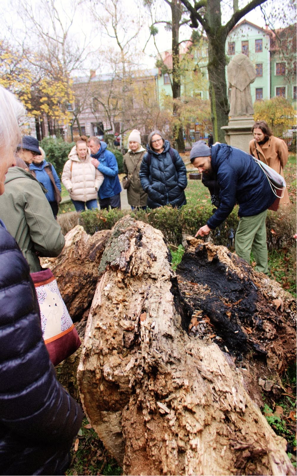 W Parku Pokoju, do którego docieramy przez dziedziniec Muzeum Śląska Cieszyńskiego, gdzie toczy się dyskusja o siedliskach kosów i o ich stopniowym znikaniu z naszego miasta, zatrzymujemy się na dłuższą chwilę, by podziwiać liczne mimo pory roku ptaki – sikory modraszki i bogatki, kawki, sierpówki, a nawet dzięcioła dużego. Z uwaga oglądamy rozkładający się pień starej lipy, która do niedawna była pomnikiem przyrody, ale z powodu inwazji grzybów, zaawansowanego wieku i na koniec podpalenia, została pozbawiona tego statusu, lecz teraz w postaci ściętej kłody stanowi źródło nowego życia dla organizmów w parku. Znaleźliśmy na niej zarówno rozmaite grzyby, jak i śluzowce, niewielkie siewki nowych roślin, a także przez przypadek obudziliśmy chowającego się pod korą kosarza, który niesłusznie jest brany za pająka. Brak liście na drzewach ułatwił nam obejrzenie pustych o tej porze roku gniazd – zidentyfikowano więc prawdopodobnie gniazda sroki, gołębia (być może grzywacza) i kosa.