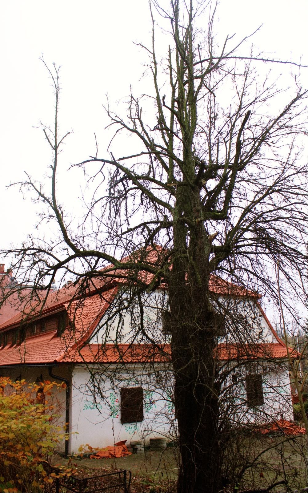 Spacer zakończyliśmy obok Dworku Cieszyńskiego przy starej gruszy, która prawdopodobnie jest jedyną pozostałością po rosnącym tu kiedyś sadzie. Grusza rośnie w trudnych warunkach, z korzeniami mocno ograniczonymi kostką brukową, z częściowo wycofującą się (zamierającą) koroną, ale mimo to wciąż zachowuje żywotność i jak każde stare drzewo jest niemym świadkiem czasów, których już nikt z żyjących ludzi nie pamięta.