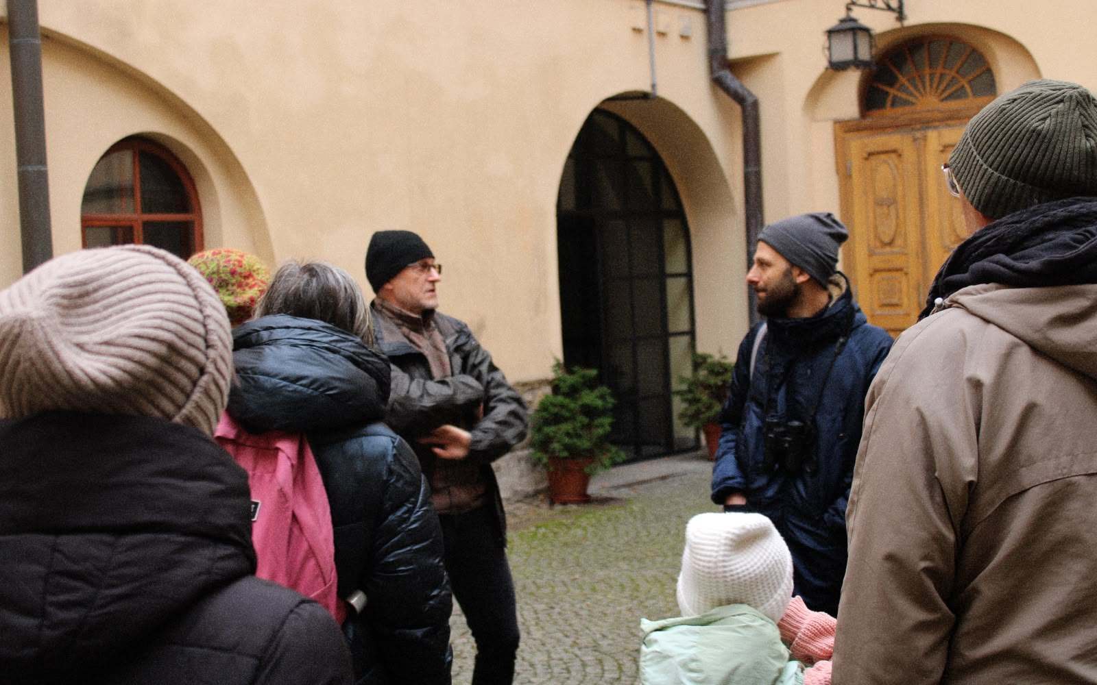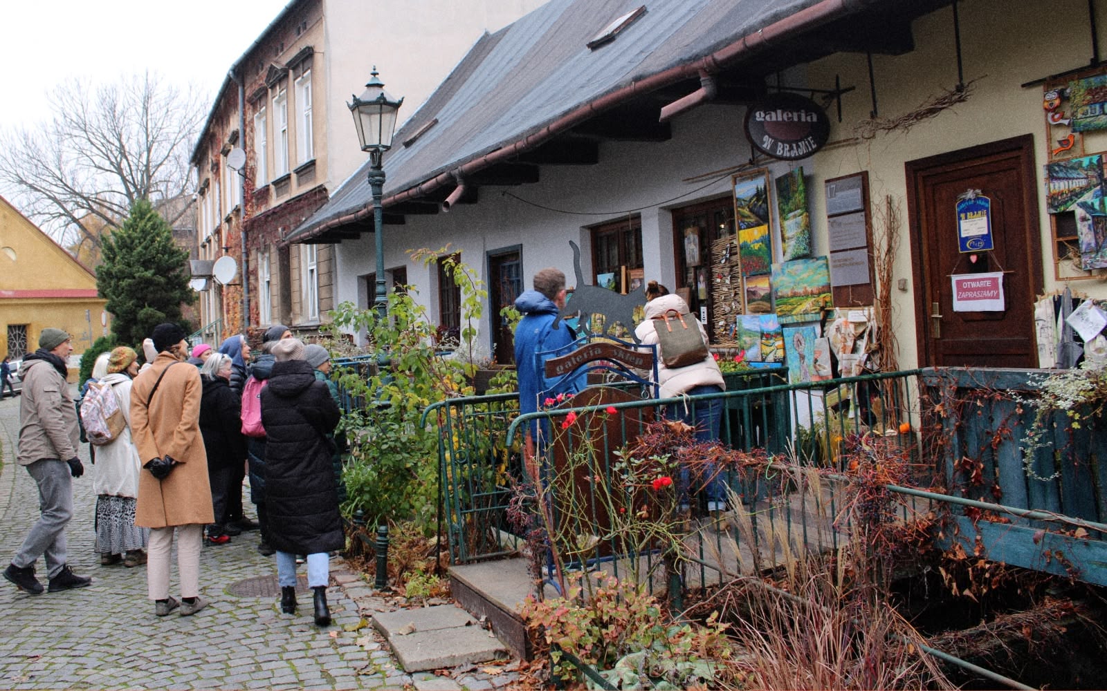 Nasz spacer wiódł spod cieszyńskiego ratusza, przez ul. Regera, Park Pokoju, Limanowskiego, Schodową, Przykopę, Al. Łyska, aby zakończyć się pod wiekową gruszą przy Dworku Cieszyńskim. Na początek zajrzeliśmy pomiędzy zwarte bruki, gdzie swoje miejsce coraz śmielej odnajdują mchy, glony, porosty, karmniki (rośliny z rodzaju goździkowatych) i inne trudne do rozpoznania liściaste maleństwa. W okolicach siedziby Stowarzyszenia Serfenta, gdzie z dachu spada więcej życiodajnej wody, roślinność jest nieco obfitsza, znajdujemy więc prawdopodobnie dziką marchew i przymiotno białe, drobne kępki trawy. Nasz gość zwraca uwagę na zamontowane na elewacjach okrutne kolce, które mogą kaleczyć ptaki, i sugeruje wymianę ich na równie skuteczne spirale.