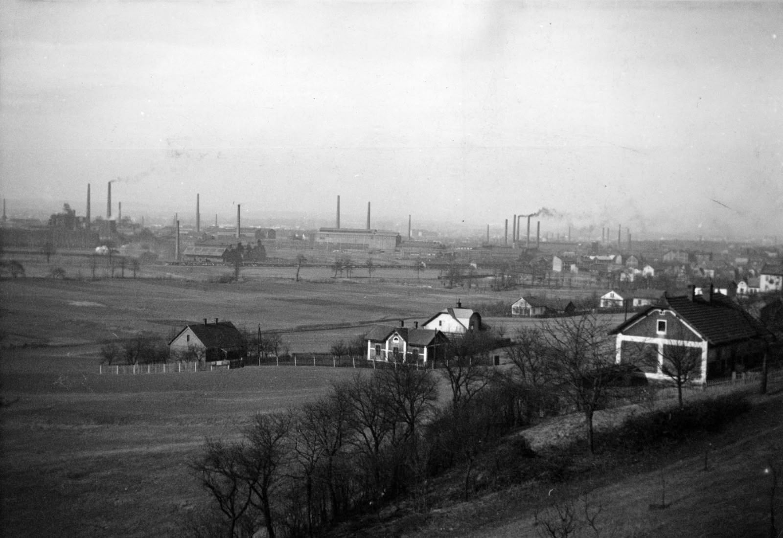 Panorama Karwiny z 1939 roku. Widok na Hutę w Trzyńcu oraz zdjęcie z dnia Święta literatury polskiej i wizyty literatów w Hucie Trzyniec.
