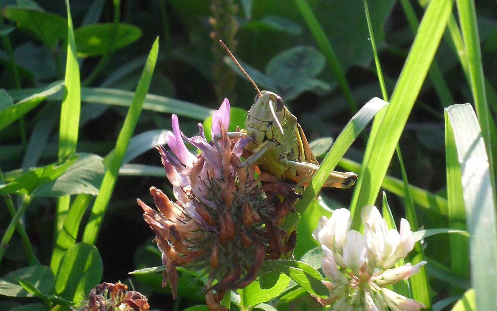 Nie, bynajmniej nie chodzi o nadmiar słońca i przypieczone nogi. To napierśnik torfowiskowy, Stethophyma grossum, posiada charakterystyczne czerwone ubarwienie na udach, dzięki czemu po jakimś czasie, spędzonym już na pewnej bobreckiej łące, nauczyłam się go prawie bezbłędnie rozpoznawać (dotyczy to głównie osobników dorosłych, z larwami jest “trochę” trudniej). Nie muszę chyba dodawać, że zachwyciłam się tym dużym, ładnie ubarwionym “konikiem”.