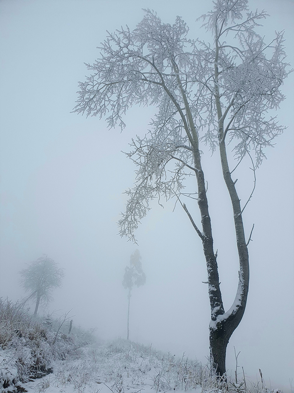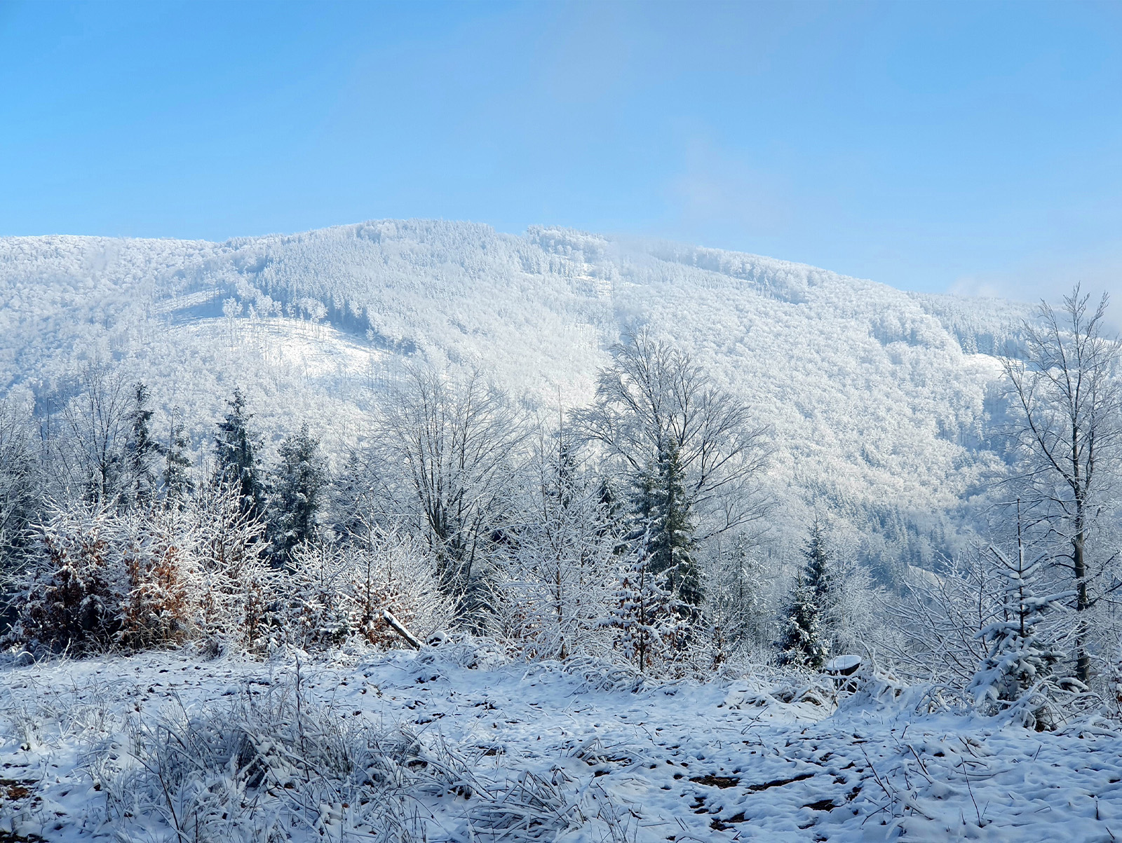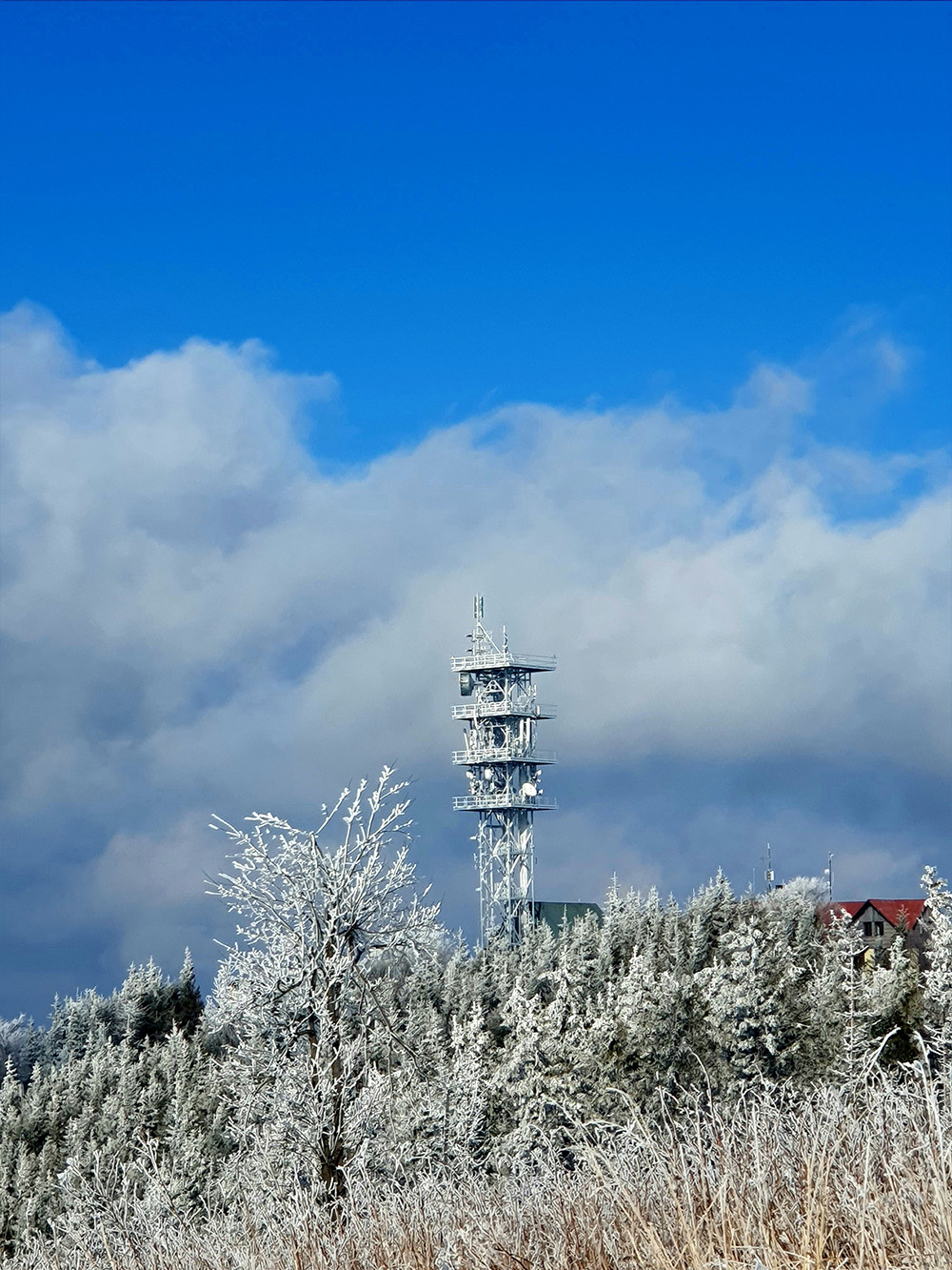 Teraz niebieskim szlakiem przez Szyndzielnię (Šindelná, 1003 m n.p.m.) idziecie na Javorový (1032 m n.p.m.) i Malý Javorový (946 m n.p.m.), gdzie czekają na was ośnieżone, oszronione i wysmagane wiatrem drzewa oraz piękne widoki – z jednej strony na niziny i Trzyniec, a z drugiej strony na Beskidy.