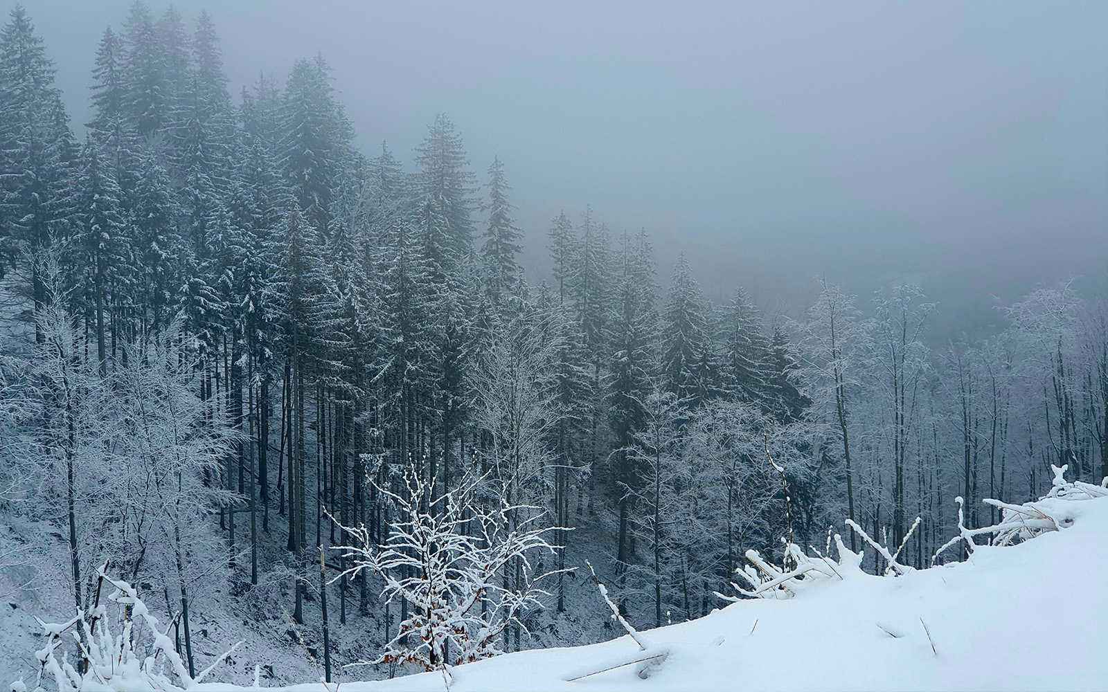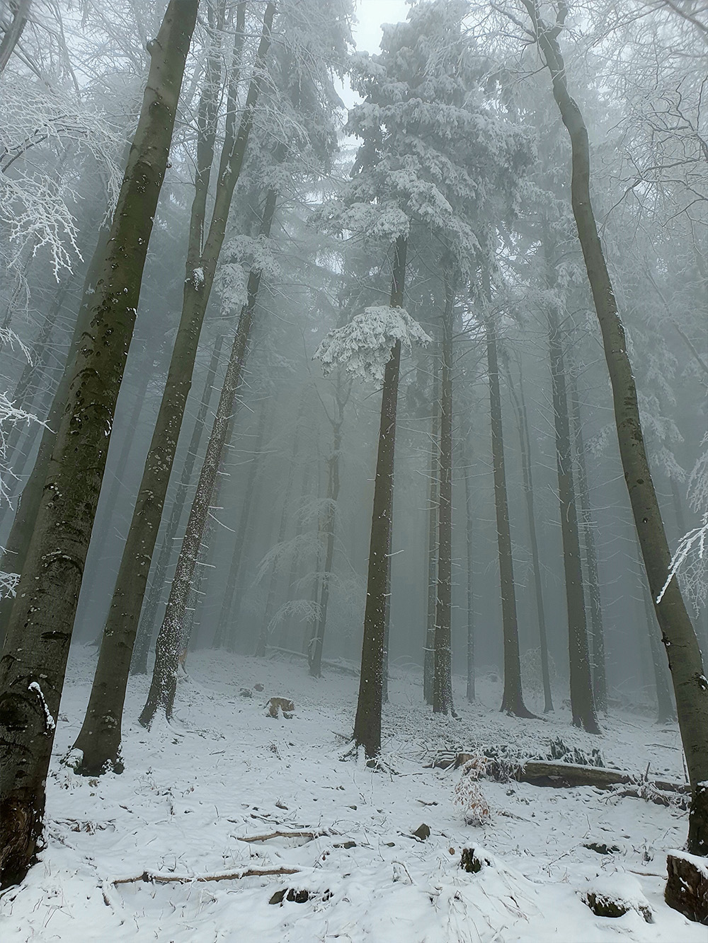Dalej ścieżką przez las do niebieskiego szlaku do siodła pod Szyndzielnią (Šindelná sedlo, 961 m n.p.m.) i na Stezky z Lásky. Zimowy las przywita was ciszą, spokojem i pięknym, rozproszonym światłem. Odpocznijcie tu, zanim dojdziecie do szlaku.