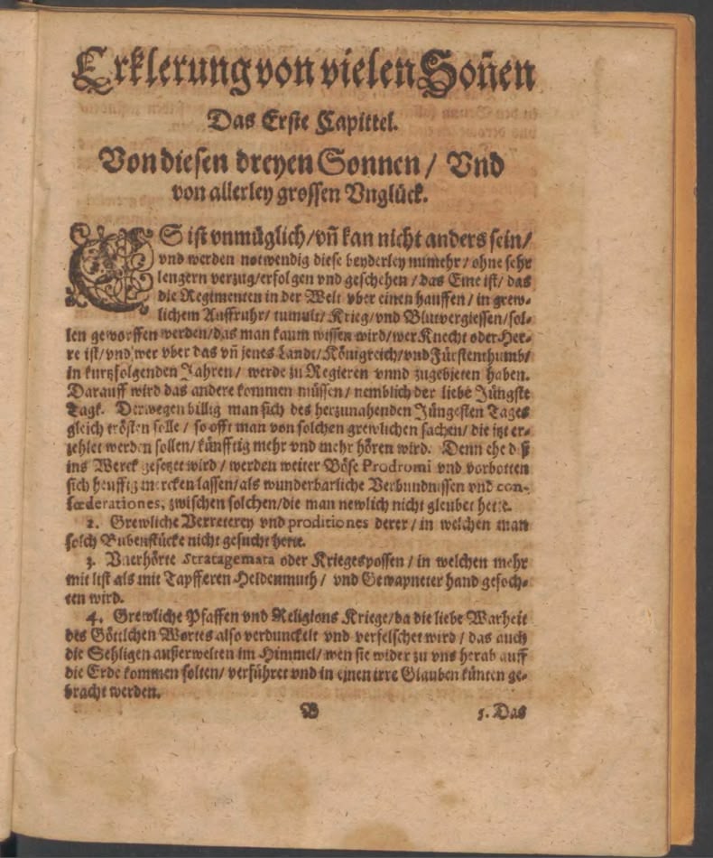 Cóż jednak owe znaki miały zwiastować? Jakkolwiek autor tego nie wyjaśnił, było dość oczywiste, że są one symbolem rozłamu w chrześcijaństwie (katolicy-luteranie-kalwini), zapowiedzią wojny, a przede wszystkim omenem śmierci monarchy. Są więc w istocie pierwszym z szeregu „Vorbotten der künfftigen grausamen Straffe Gottes” — zapowiedzi Bożej kary, jak ujął to Johann Philipp Abelin, autor tekstów zamieszczonych w pierwszym tomie „Theatrum Europeum”.